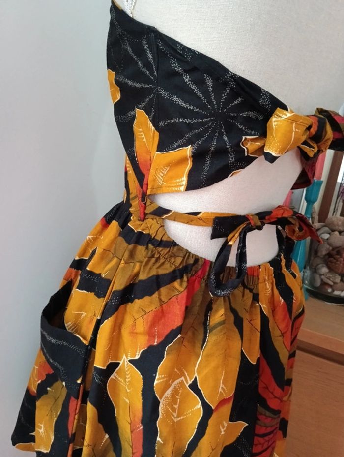 Robe bustier vintage en coton imprimé tropical Lien à attacher dans le dos au niveau de la poitrine. élastique en bas du dos. 2 poches à l'avant Armature sur les côtés du buste et à l'avant Taille 38 estimée à confirmer avec les mesures Mesures Aisselles 42cm Taille 38cm Longueur 62cm