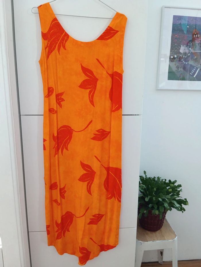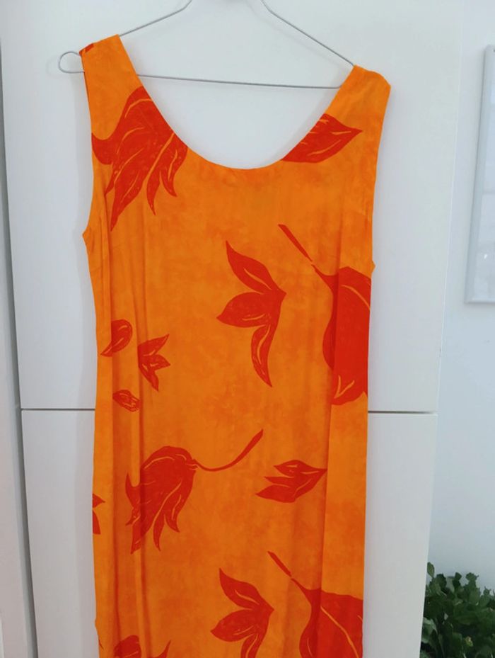 Robe longue en viscose orange à fleurs , De la marque Garuda Fendue sur les côtés. Coupe droite. Taille L à confirmer avec les mesures Epaules 38cm Aisselles 48cm Longueur 130cm