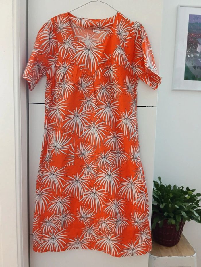 Robe droite en coton orange motifs fleurs blanches taille 38 Agréable pour l'été Mesures Aisselles 53cm Longueur 11cm
