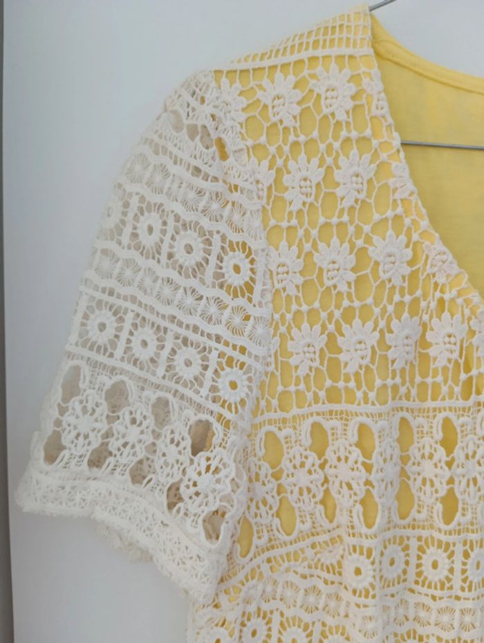 Robe fond jaune crochet écru taille M Vila Fond jaune polyester, crocheté coton Mesures Epaules 38cm Aisselles 45cm Longueur 91cm