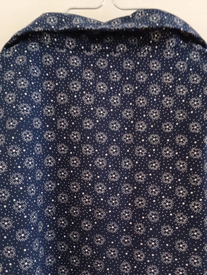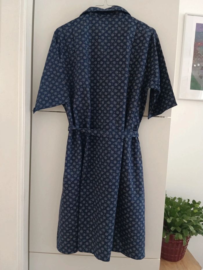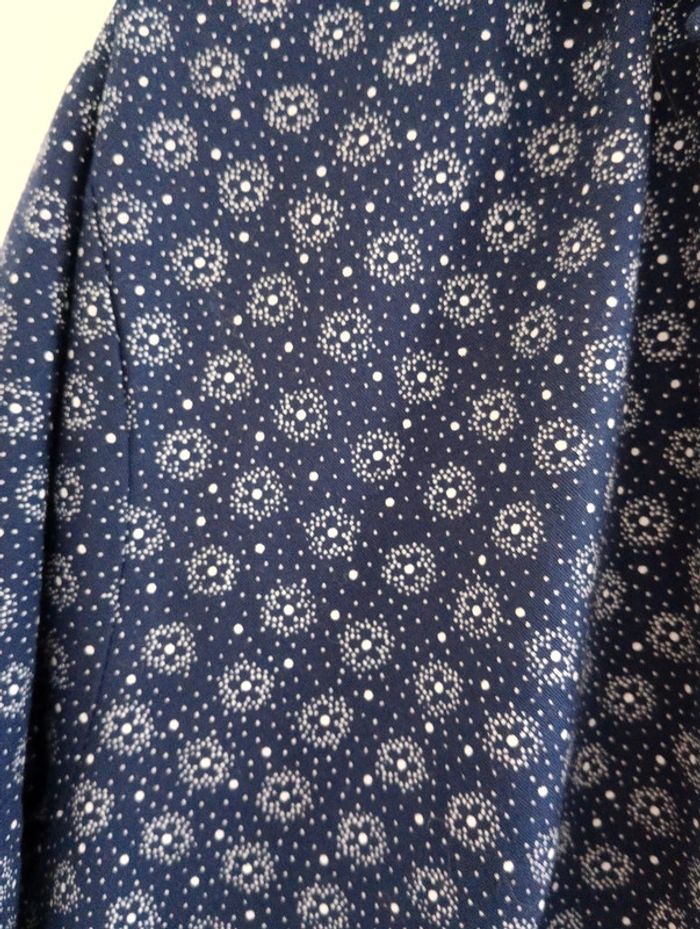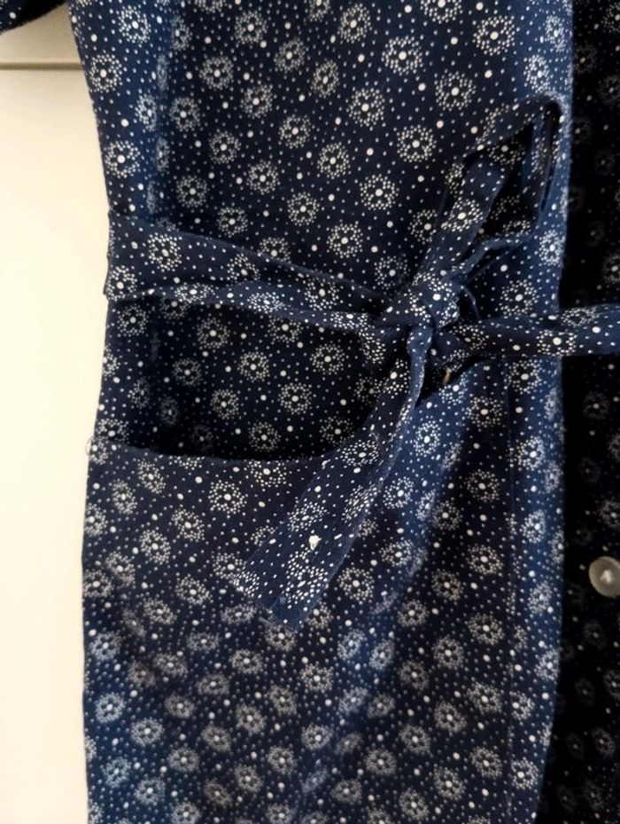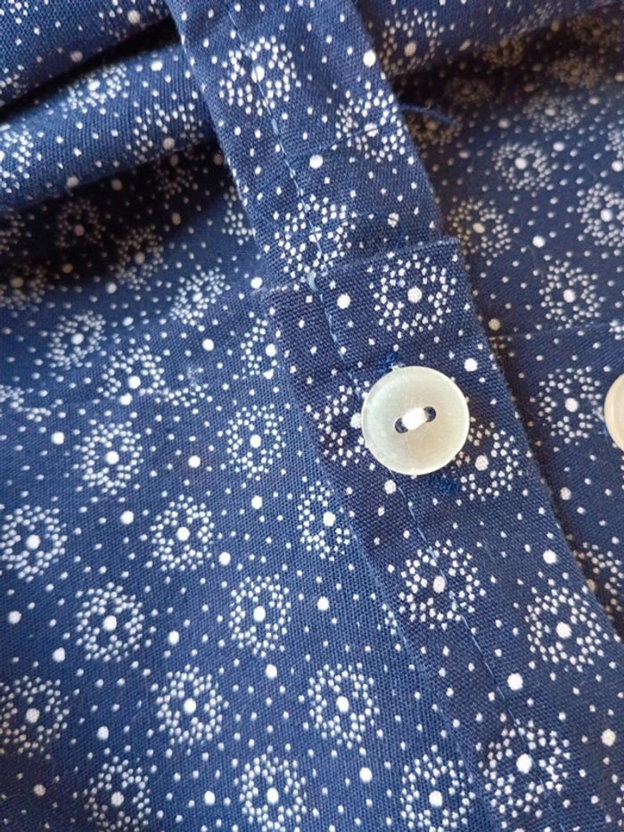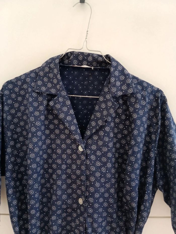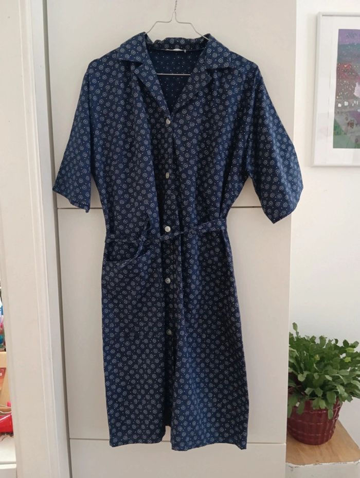 Robe vintage en coton boutonnée style tablier Bleu à petits motifs blancs. Ceinture intégrée cousue à la taille ,à boutonner au bout. Vintage taille 50 indiquée mais convient pour 44 à confirmer avec les mesures. 100% coton Épaules 44cm Aisselles 58cm Longueur 99cm