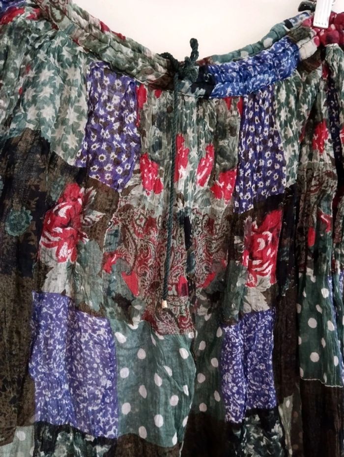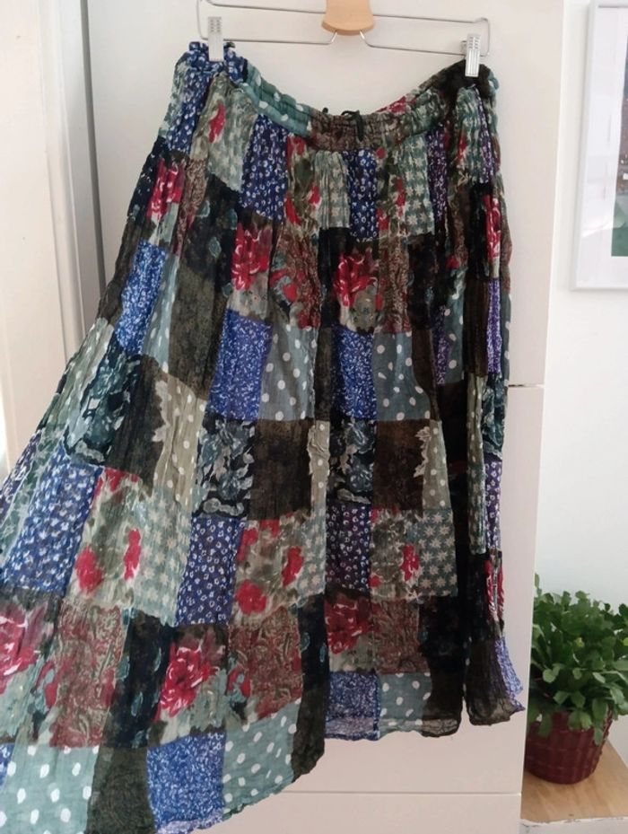 Jupe voile de coton imprimé motif patchwork multicolore . Légère , transparente. Lien à la taille pour resserrer (pas d'élastique) Taille 46/48 estimée mais peut convenir à plusieurs tailles, à confirmer avec les mesures. Mesures Taille (lien défait) 58cm Longueur 89cm