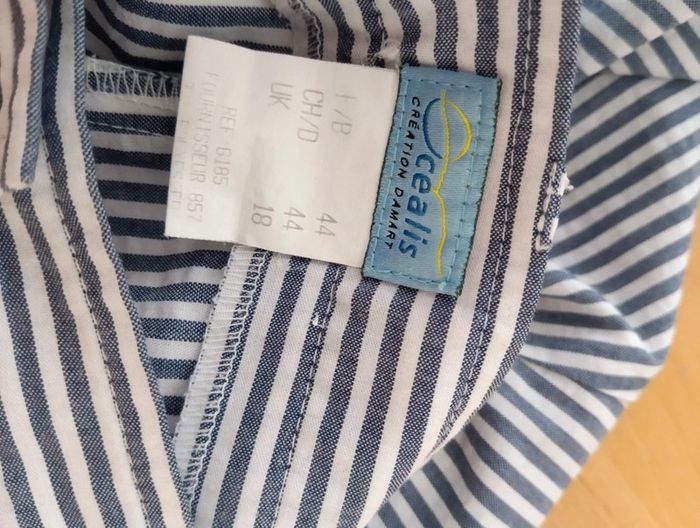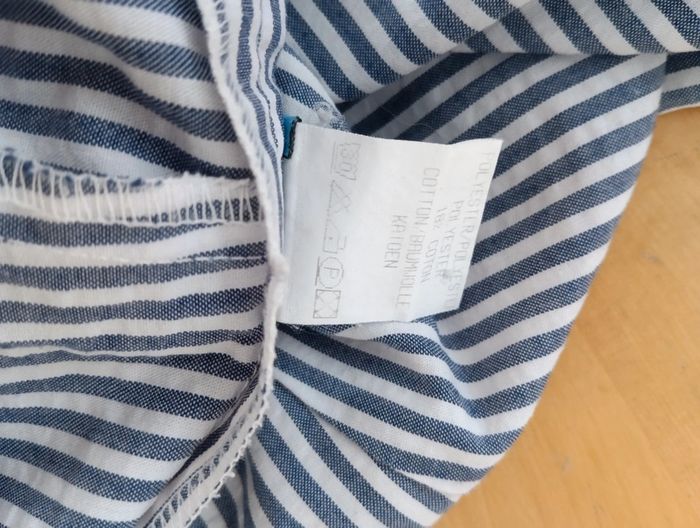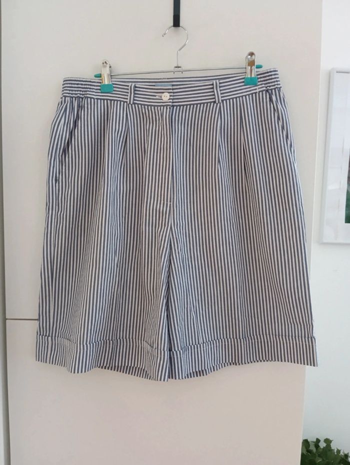 Bermuda vintage à rayures blanc/bleu Taille élastique sur les côtés Taille 40/42 estimée à confirmer avec les mesures : Taille légèrement extensible de 40 à 43cm De la taille à l'entrejambe 33cm Longueur 52cm Très agréable à porter, mélange coton polyester