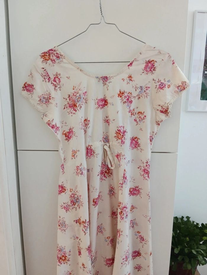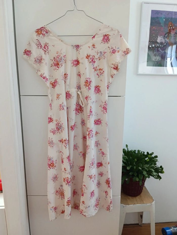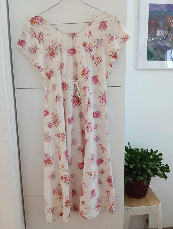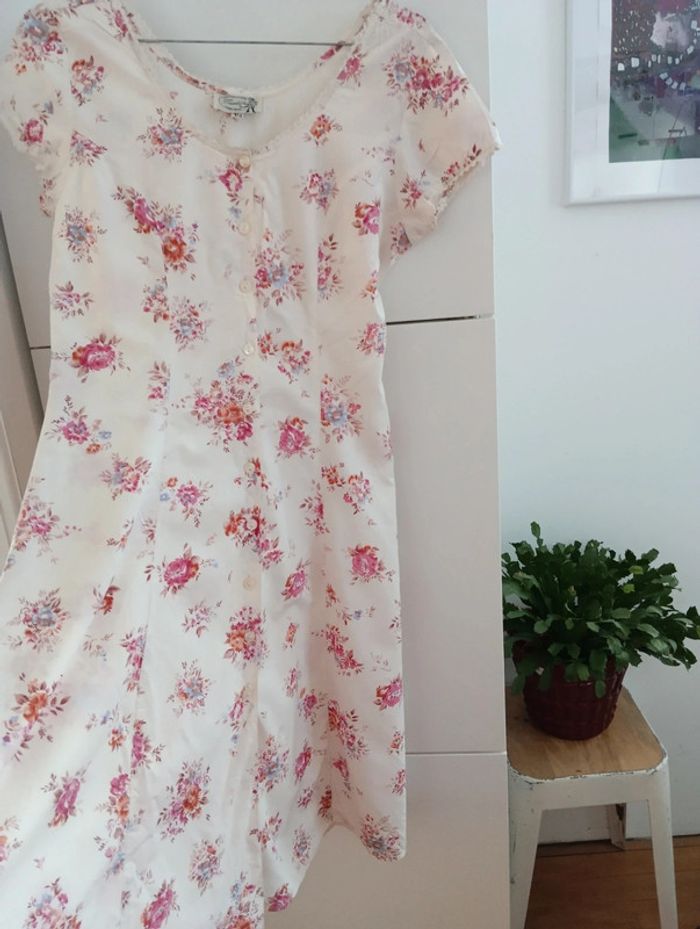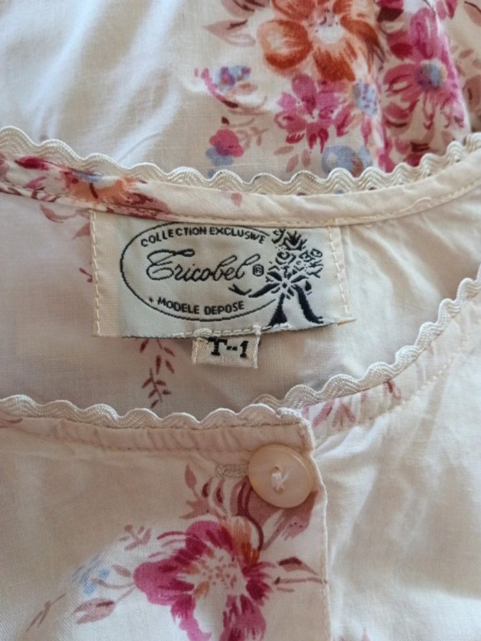 Robe vintage fleurie boutonnée En viscose De la marque tricobel 65% viscose 35% coton Lien au dos pour ajuster la taille. Taille 1 indiquée doit convenir pour la taille 38 à confirmer avec les Mesures Epaules 42cm Aisselles 49cm Longueur 108cm