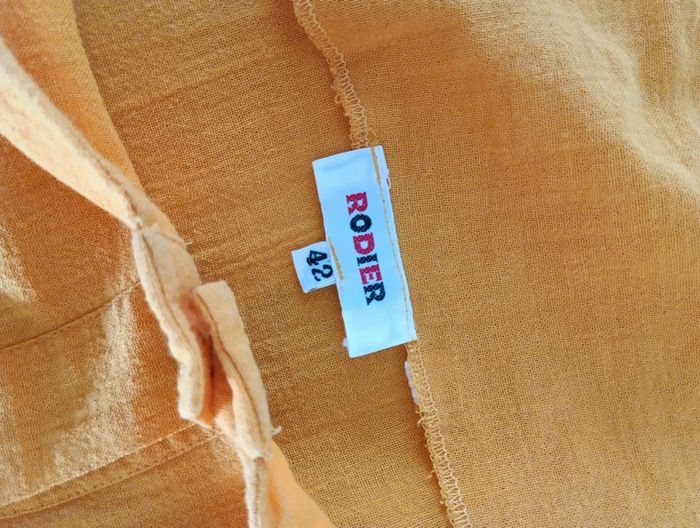 Robe Rodier vintage Boutonnée forme trapèze , évasée Taille 42 indiquée peut convenir à plus grand à confirmer avec les mesures Non doublée Probablement en coton mais pas d'étiquette pour le confirmer. Légère et légèrement transparente, idéale pour mettre Deux poches de chaque côté Mesures Épaules 35cm Aisselles 52cm Longueur 96cm