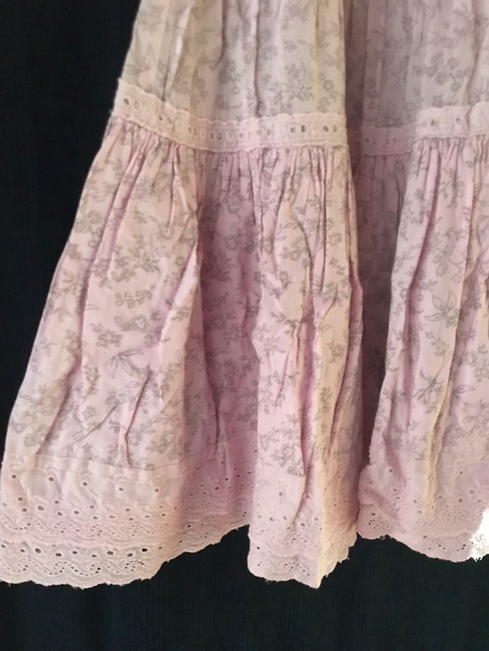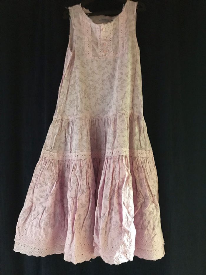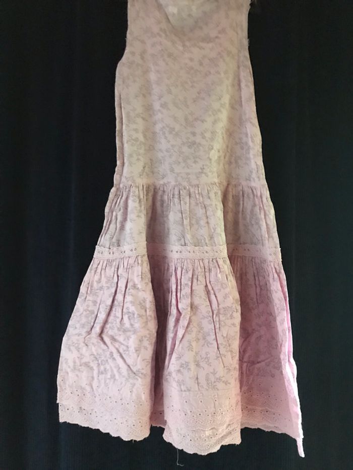 robe longue Okaidi en 8 ans. sans manches fleurs grises sur fond rose. finition à cru ( sans coutures) autour de l’encolure et des épaules. très ample, tourne bien!