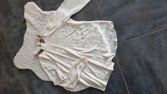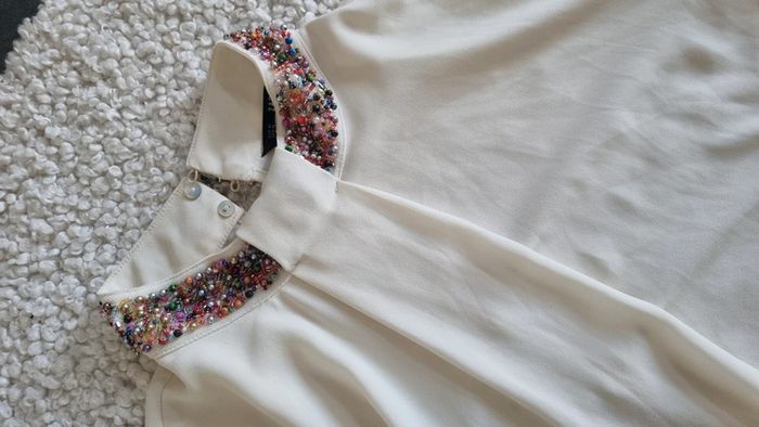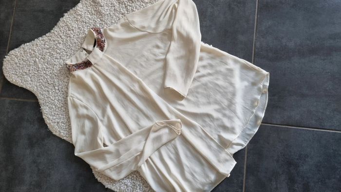 Chemisier zara beige ▪︎ col avec bijoux ▪︎ état neuf ▪︎ taille M 38 40 Envoi possible à 0.99 en mondial relais en France, me demander 😉😊