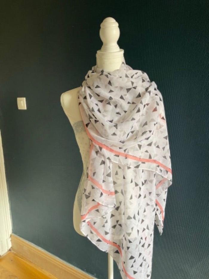 Vends un grand foulard en excellent état 89x188 cm Motifs triangles, coloris blanc, rose saumon et noir. #galad57_dressingfemme_accessoires