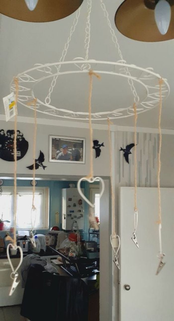 Support photo ou autres avec un crochet et 5 pinces. Décor cœur. Matière fer