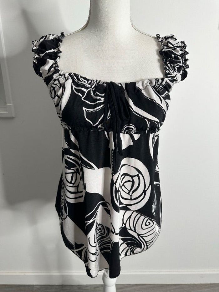 Blouse - Excellent état - Taille unique (ok du 36 au 40) - Noire et blanche - Imprimés psychédéliques fleurs - Fabrication française 🇫🇷 - Vintage, années 80’ - Style Y2K - Lien ajustable au niveau du décolleté - Viscose, polyester, élastane
