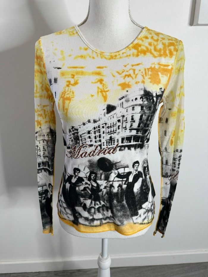 Top - Excellent état - Taille 38 équivalent M - Jaune et gris - Manches en mesh - Buste en coton - Style Y2K, années 2000’ - Imprimés Madrid, strass à l’avant - Coton et spandex Dimensions: - 40 à 48cm niveau aisselles - 57cm de long