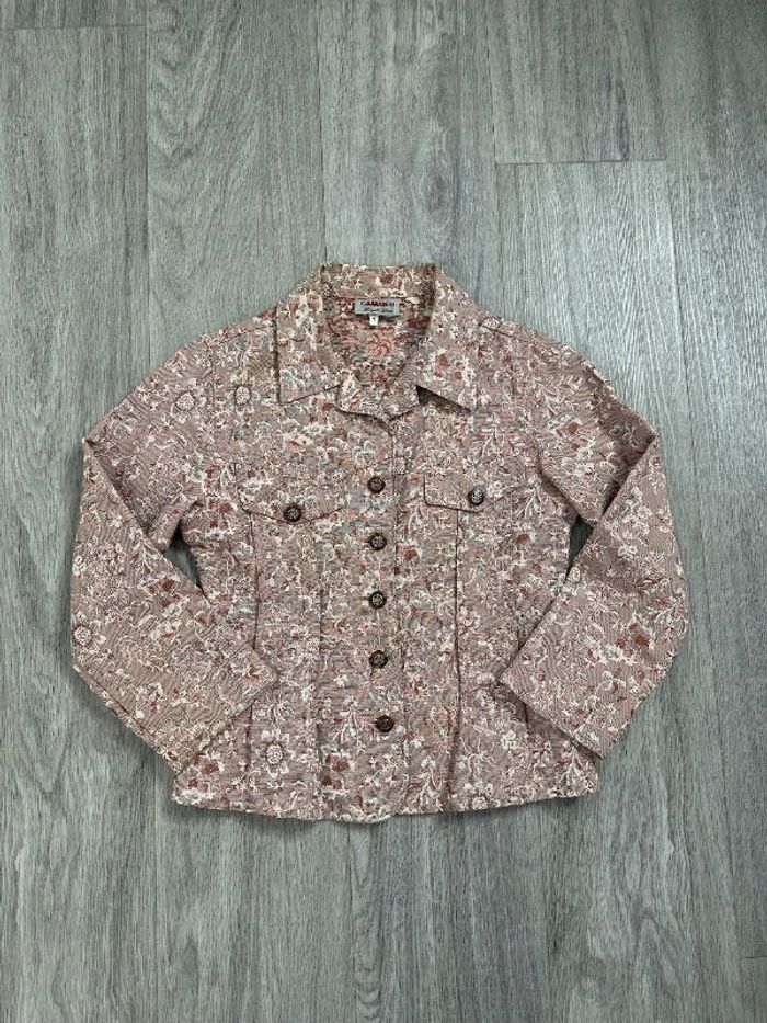Veste en jean denim - Excellent état - Taille 36 équivalent S - Camaïeu Vintage, ancienne étiquette de la marque - Se ferme avec des boutons - Couleur vieux rose et blanc - Imprimés fleurs - Style tapisserie - Tissus fin - Coton et polyester - Fabrication française 🇫🇷 Dimensions: - 42 à 52cm niveau aisselles - 61cm de long