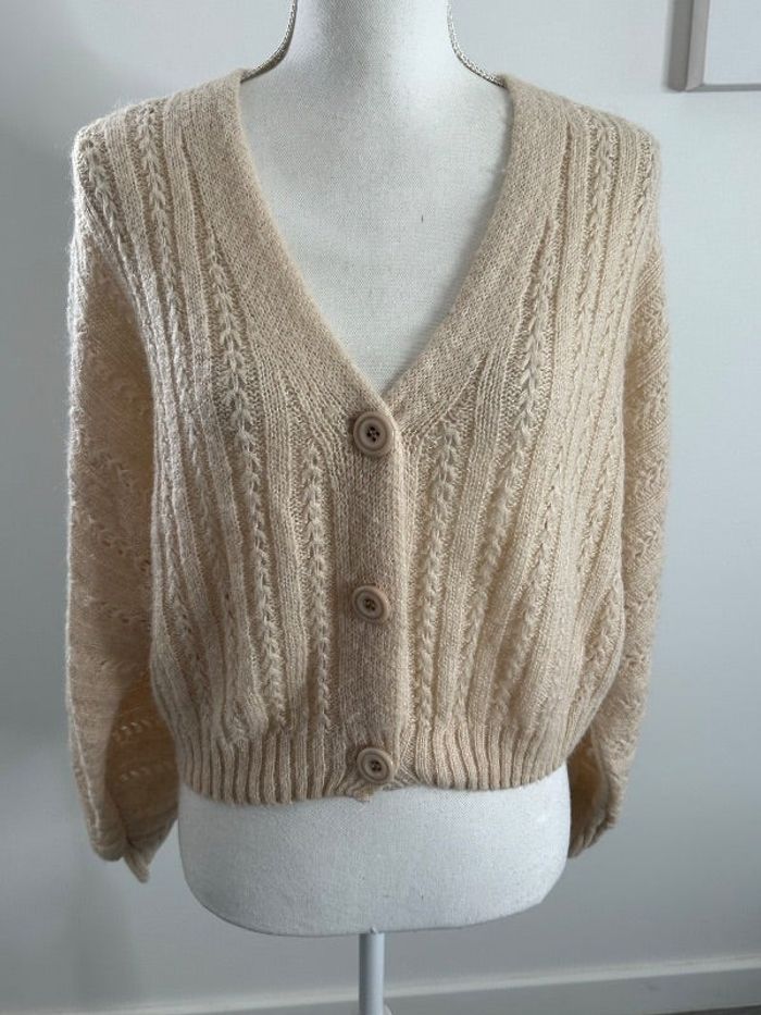 Cardigan - Excellent état - Taille 44 équivalent XXL Dimensions en bas de l’annonce - Beige crème - Maille légèrement ajourée - Ultra doux et chaud - Se ferme avec des boutons - Pas d’étiquette de taille ni de matière - Probablement laine et mohair Dimensions: - 74cm niveau aisselles - 50cm de long
