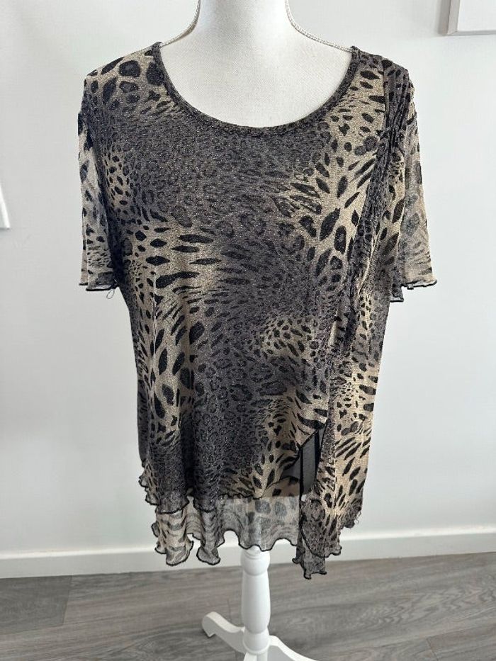 Blouse top - Excellent état - Taille 44/46 équivalent 2XL/3XL - Manches courtes - Imprimés léopard - Col rond - Manches courtes - Beige crème et noir pailleté - Tissus mesh - Style Y2K - Tissus super stretch - Viscose et coton Dimensions: - 63 à 80cm niveau aisselles - 70cm de long