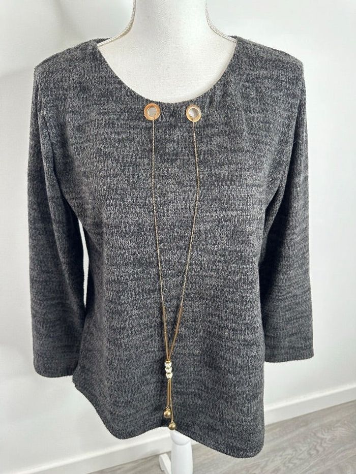 Blouse - Excellent état - Taille unique - Grise mouchetée - Manches 3/4 - Acrylique et élastane - Collier intégré