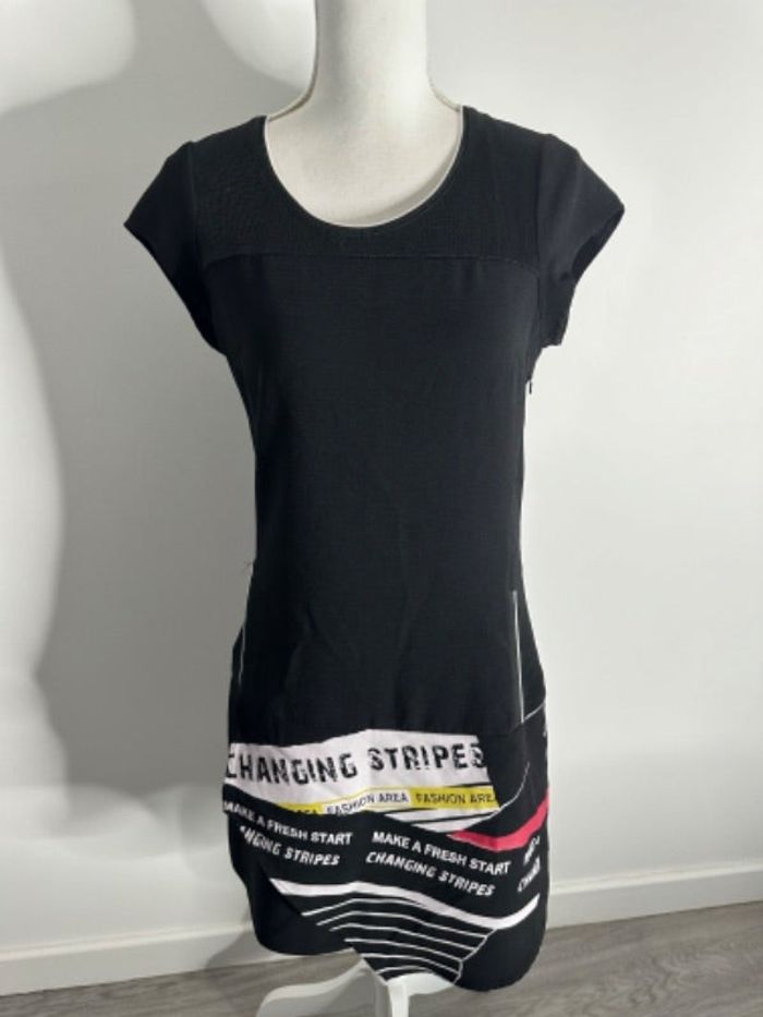 Robe - Neuve avec étiquette - Taille 38 équivalent M - Miss Captain Trend - Manches courtes - Coupe asymétrique - Imprimés bariolés sur le bas - Noire et multicolore - Zip sur le côté - Polyester et élastane Dimensions: - 46cm niveau aisselles - 90 à 94cm de long
