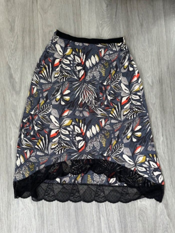 Jupe - Excellent état - Taille 0 équivalent 34 XS Peut également convenir à un 36/38 S/M - Trend by Captain Tortue - Imprimés fleurs - Dentelle sur le bas - Coupe asymétrique - Satin et dentelle - Élastique à la taille - 100% Polyester Dimensions: - 34 à 40cm à la taille - 61cm au plus court - 76cm au plus long