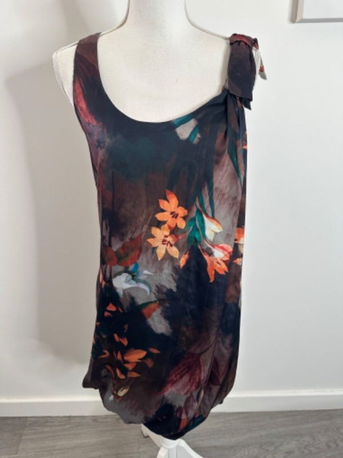 Robe à fleurs - Bon état, fils tirés (voir photos) - Taille 36 équivalent S - Noire et multicolore - Marque H&M - Tissus satiné - Imprimés fleurs - 100% Polyester