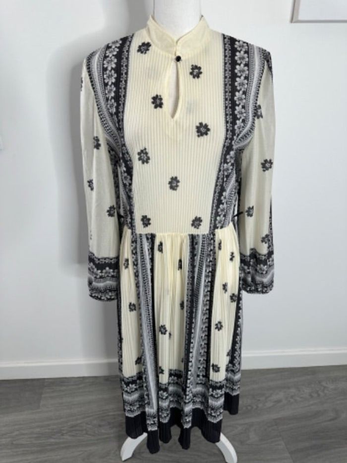 Robe longue - Excellent état - Taille 46 équivalent 3XL - Marque C&A (ancienne étiquette de la marque) - Vintage, années 80-90’ - Fabriquée en Angleterre 🇬🇧🏴󠁧󠁢󠁥󠁮󠁧󠁿 - Élastique à la taille - Buste et bas plissé - Bouton au niveau du col - Beige crème et noir - Imprimés fleurs, Paisley - 100% polyester Dimensions: - 45cm niveau épaule - 55cm niveau aisselle - 112cm de long