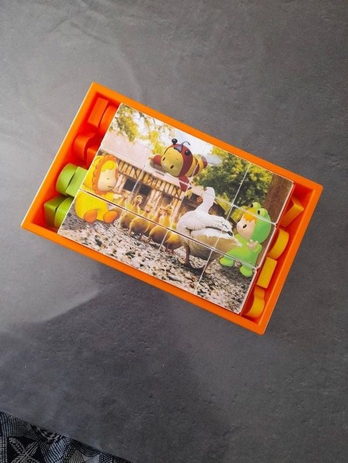 Dès 1 an Cubes d'éveil pour faire une tour, deux puzzles ou jouer avec les formes Quelques traces d'usure mais en encore en excellent état