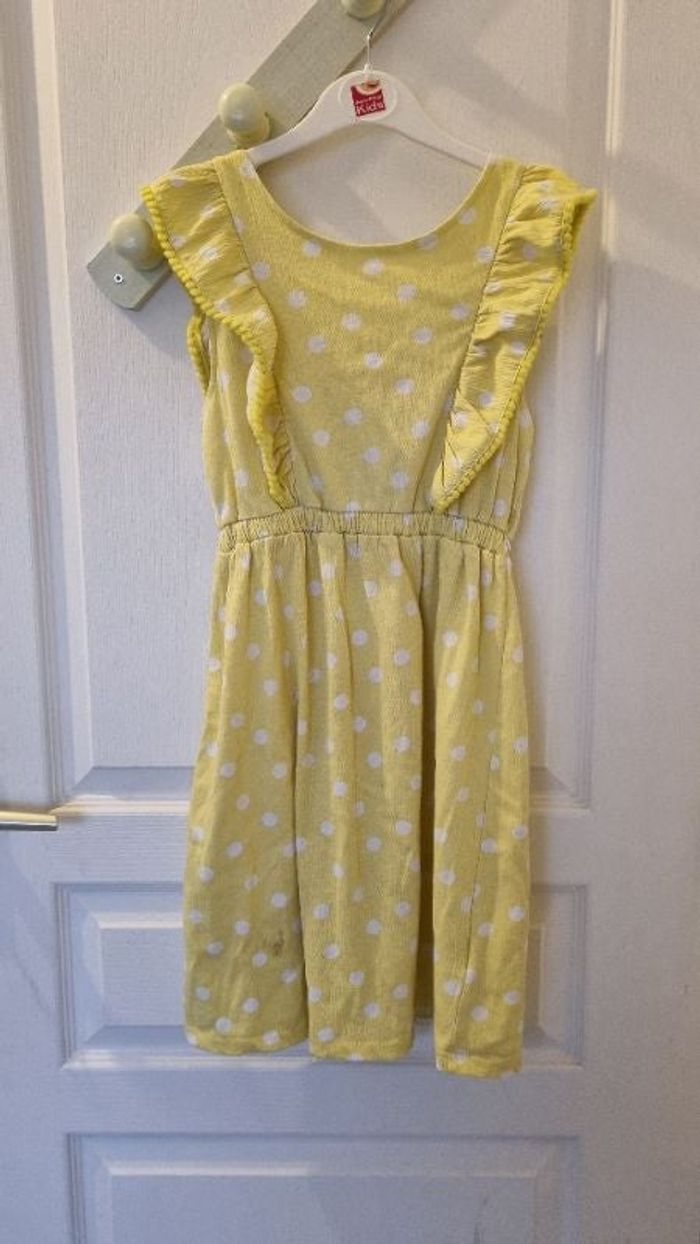Robe légère Jaune à rond / point blanc Bon état Pas déchiré mais une trace sur le bas Taille 8 ans, plus d'étiquette Marque kiabi