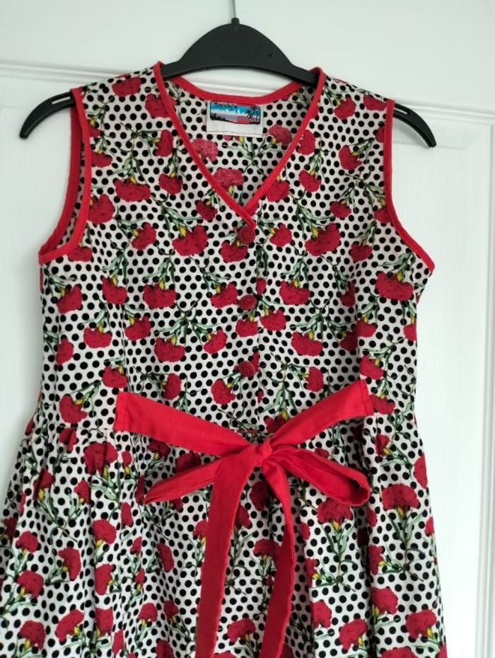 Jolie robe noir et blanc imprimée fleurs rouges, noeud à la taille.