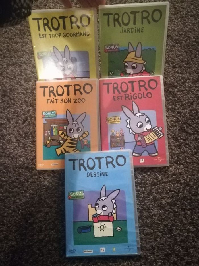 Trotro est gourmand. Trotro est rigolo. Trotro fait son zoo. Trotro jardine (pochette abîmée). Trotro dessine (un coin de couverture arrière déchirée).
