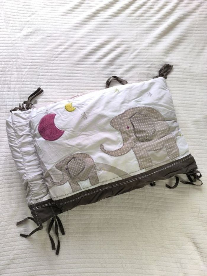 Jolie tour de lit bien rembourrée , il est déhoussable. Juste des défauts à un endroit où le chat avait mis ses griffes