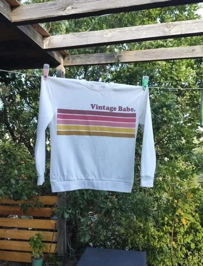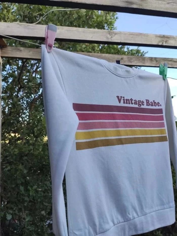 Sweet shirt / pull style vintage avec des couleurs un peu passées comme s'il s'agissait d'un vieux sweat alors qu'il est en très bon état Toute petite tâche en bas d'une manche qui se voit vraiment peu mais je préfère le préciser 😉 Taille XS - 14 ans #vulariFemmesXS34
