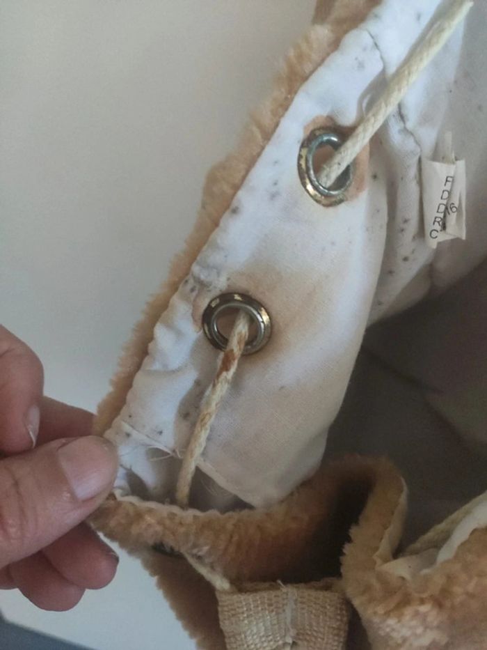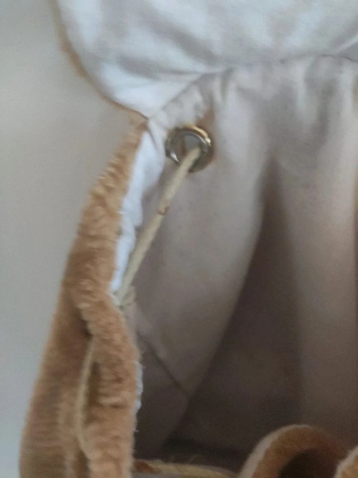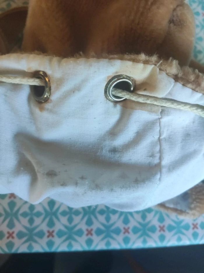 Une matière toute douce comme une peluche, une poche devant et un bouton de pression pour le sac avec un lien à serrer et des pompons. Bretelles réglables, l'extérieur est en très bon état mais il y a beaucoup de tâches à l'intérieur, je n'ai pas essayé de le nettoyer. Largeur 29 cm hauteur 25 cm