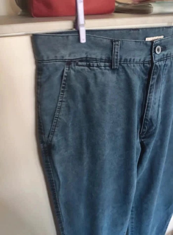 Pantalon en toile aspect jean mais ce n'est pas un jean. 2 poches cavalières, 2 poches au dos fermées par un bouton et passants pour une ceinture. Bon état, taille 46, très bonne marque Lloyd's. Acheté à Corte Ingles en Espagne #vulariHommesXL