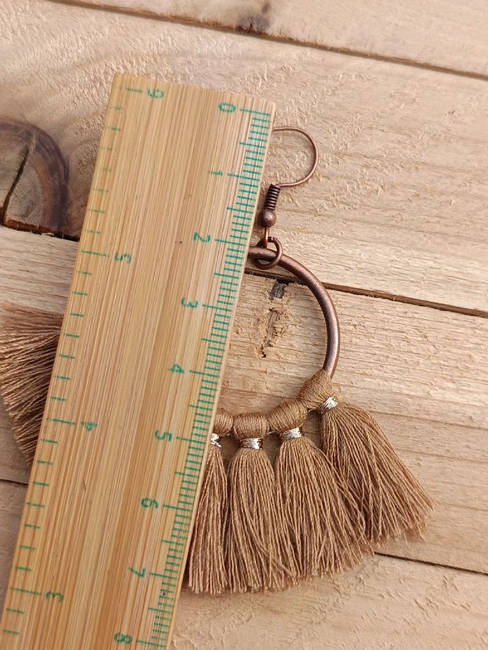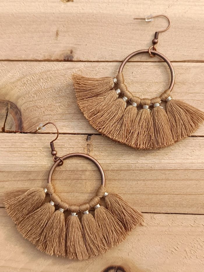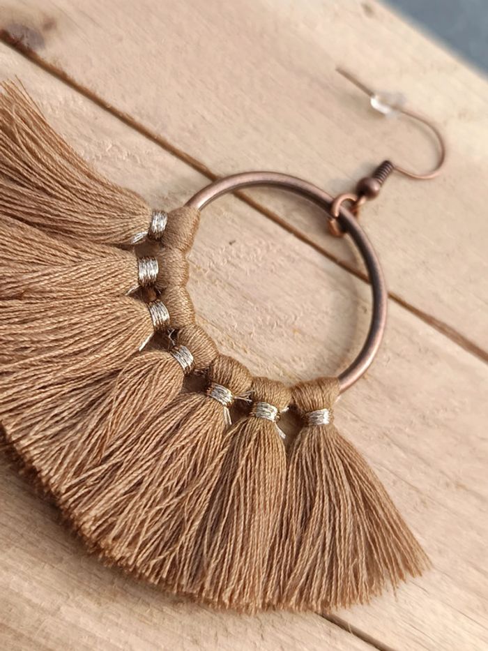 Boucles d’oreilles bohèmes Jolies boucles d’oreilles style bohème en fil beige et anneau cuivre. Très légères et pleines de charme, parfaites pour l’été ! Envoi rapide et soigné. 📦 #bijoubohème