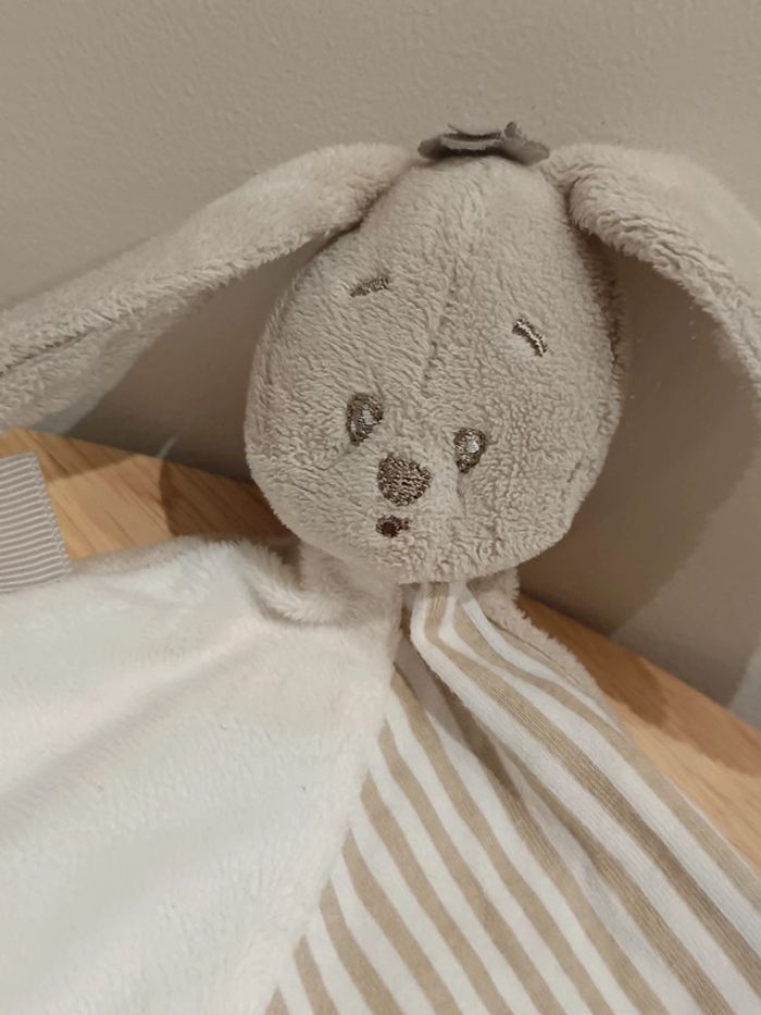 Doudou plat lapin avec étoiles Gris beige blanc et rayures Très bon état Auchan Expédié sous 24h 📦