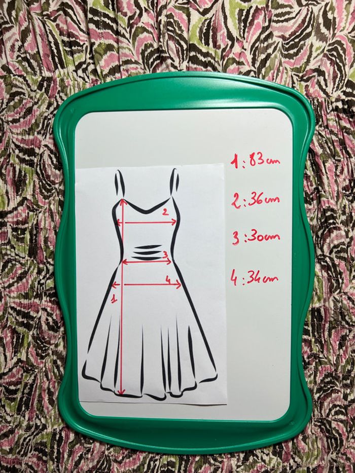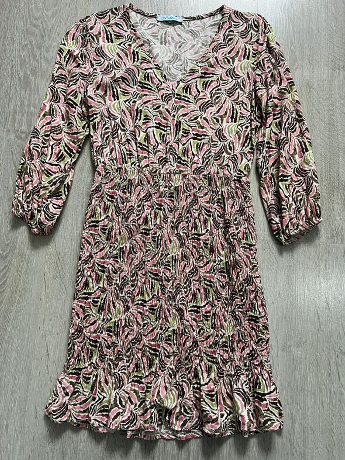 ✨ Robe fluide à motifs colorés (rose, noir, vert, beige) – parfaite pour la mi-saison ou l’été. Manches 3/4, coupe féminine légèrement cintrée à la taille, tissu souple et agréable à porter. 👗 Style chic-décontracté, idéal pour une journée au bureau, une sortie entre amis ou même une occasion un peu habillée avec les bons accessoires. 📏 Mesures (voir photo) : Longueur totale : 83 cm Largeur épaules : 36 cm Tour taille (à plat) : 32 cm Largeur hanches : 46 cm ➡️ Convient à une taille S/M (vérifie bien les mesures) 🧼 État : Très bon état – aucune trace ni défaut, peu portée. 💡 Envoi rapide et soigné 📦