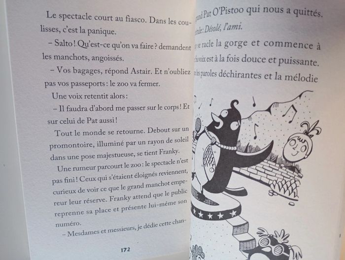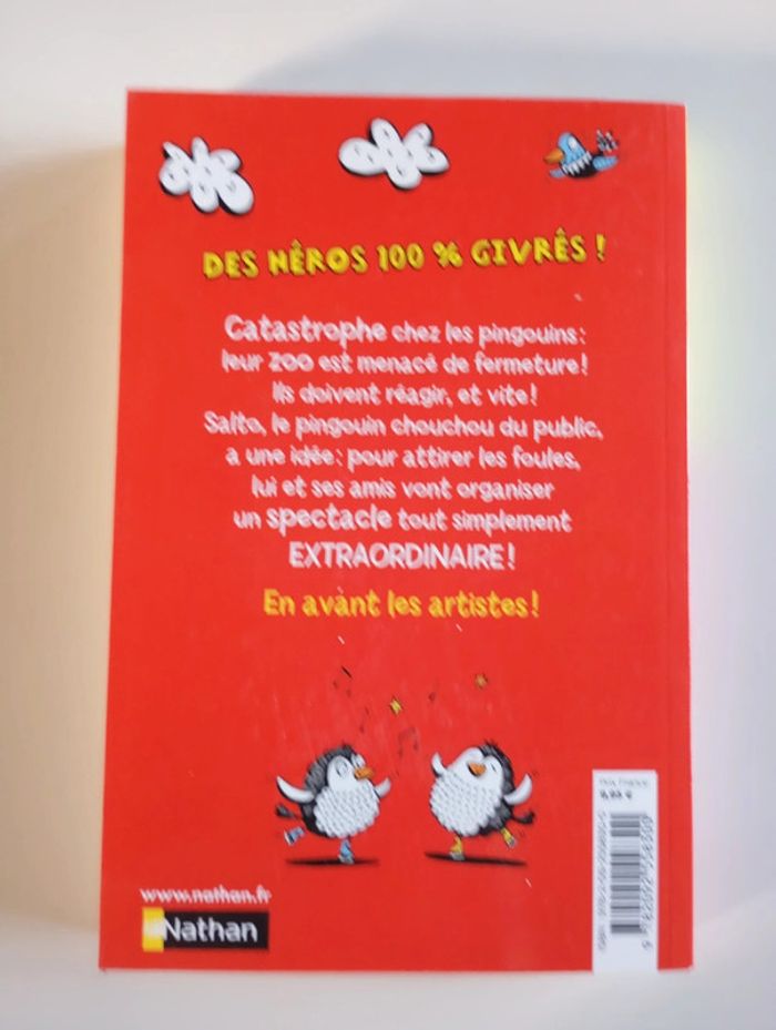 Ces pingouins-là ne savent pas voler, mais ils savent s'amuser ! Catastrophe ! Faute de visiteurs, le zoo est menacé de fermeture ! Les pingouins décident de prendre les choses en main. La caméra de surveillance braquée sur leur enclos donne une idée de génie à Salto, le pingouin star du zoo : il va organiser un véritable show pour attirer les foules. Mais ce n'est pas si facile de diriger des artistes... Heureusement, Salto a plus d'un tour dans son sac ! Éditeur ‏ : ‎ Nathan 192 pages Âge de lecture ‏ : ‎ 8 - 10 ans Dimensions ‏ : ‎ 14.2 x 2 x 21.2 cm Livre en très bon état #pingouins #zoo