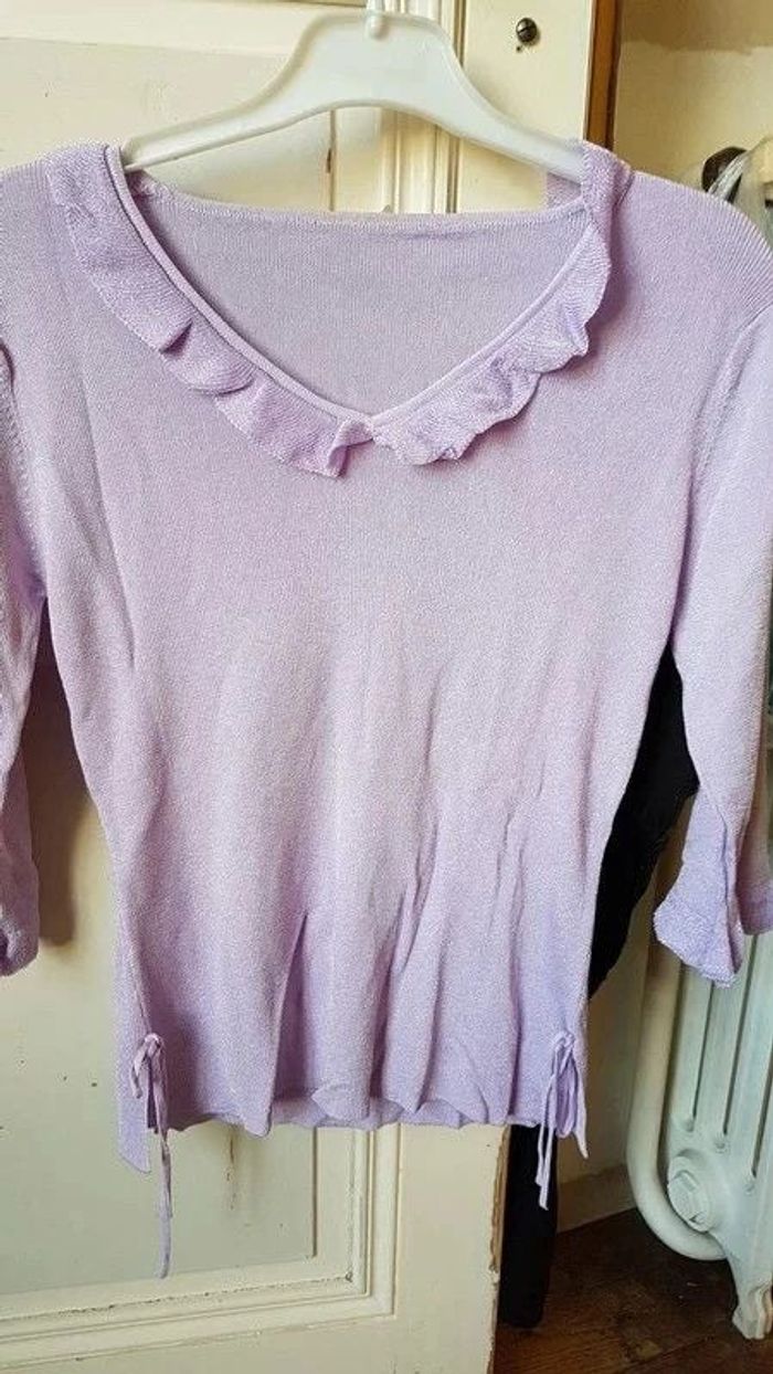 ⬇️mes autres annonces pour femme en taille 40 👉 #cg89femme40 😁 réductions activées des 2 articles ! Un top aux manches 3/4 avec un col "V" et de petits volants. Des petites fentes sur les côtés avec un petit noeud. Des petits volants également sur les manches. De couleur lilas irisé. Il est parfait sur un pantalon ou une petite jupe noire. Très bon état, taille 40