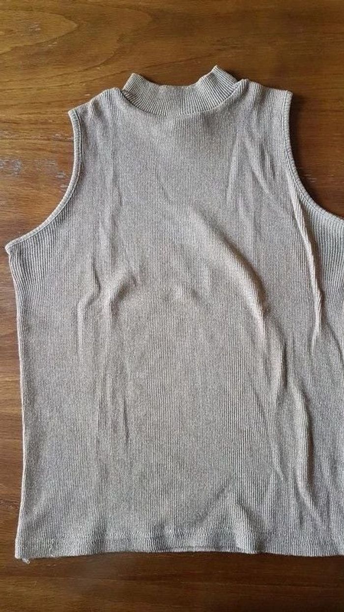 ⬇️mes autres annonces pour femme en taille 40 👉 #cg89femme40 😁 réductions activées des 2 articles ! Un débardeur col haut de couleur marron clair doré. Taille 40, très bon état, marque fashion studio