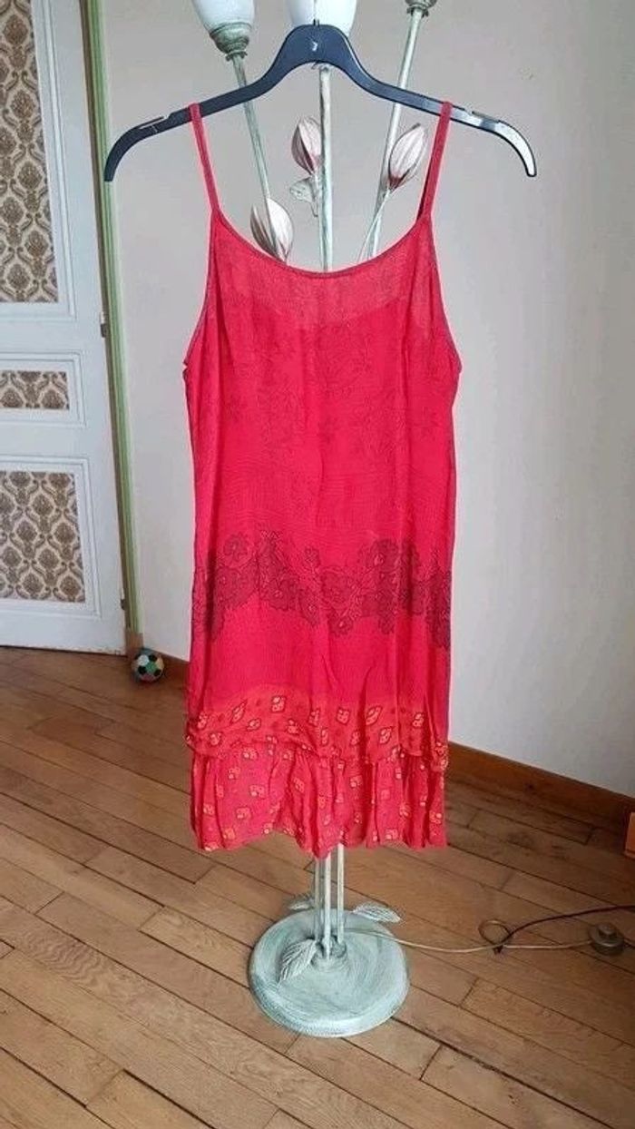 ⬇️mes autres annonces pour femme en taille 40 👉 #cg89femme40 😁 réductions activées des 2 articles ! une robe à bretelle, en voile rouge imprimé de fleurs noires (différentes nuances de noires). Lien à nouer au dos. Superposition de 2 voiles, donc elle n'est pas transparente. très bon état, taille 40, marque tricobel
