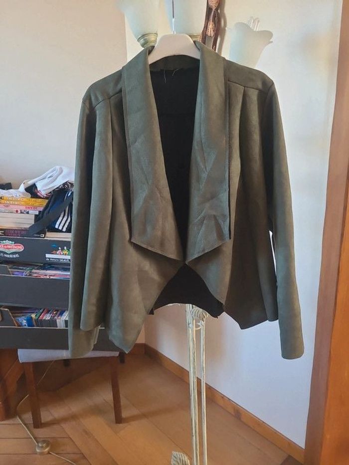 ⬇️mes autres annonces pour femme en taille 40 👉 #cg89femme40 😁 réductions activées des 2 articles ! une veste de couleur vert kaki, elle n'a pas de boutons mais elle est parfaite avec les pans devant qui lui donne cette effet moderne. Elle mesure 48 cm aisselles à aisselles, 40 cm aux épaules et 55 cm de longueur. En très bon état
