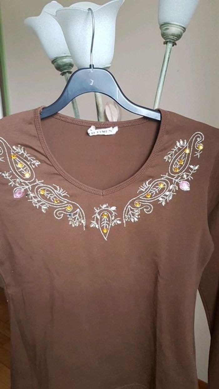 ⬇️mes autres annonces pour femme taille 38👉 #cg89femme38 😁 réductions activées des 2 articles ! un t-shirt ou top manches longues avec un col en "V". Celui -ci est entouré de broderie et de strass. bon état, taille 38 #tshirttaille38 #broderie #strass #toptaille38