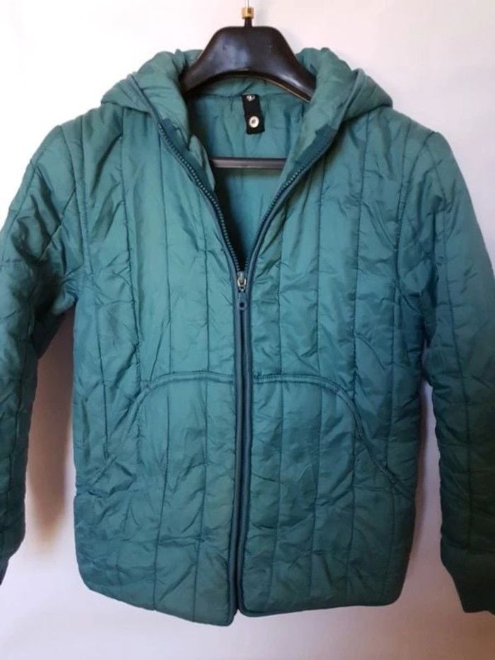 Un blouson à capuche ou manteau a capuche couleur vert- bleu. Il est chaud et la fermeture fonctionne parfaitement.