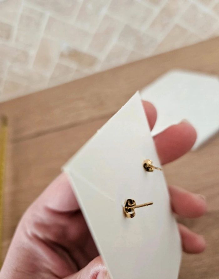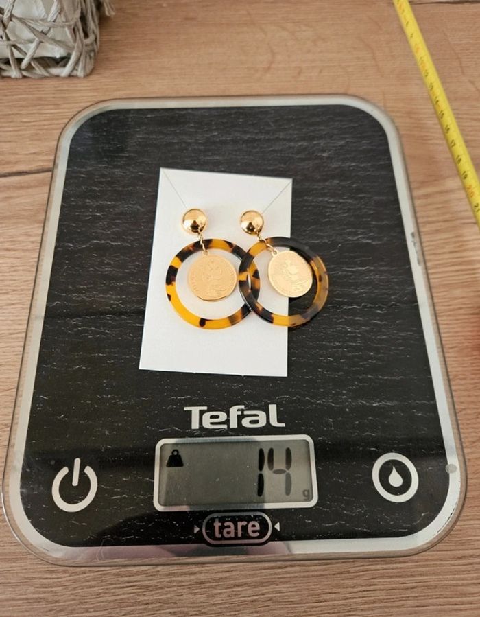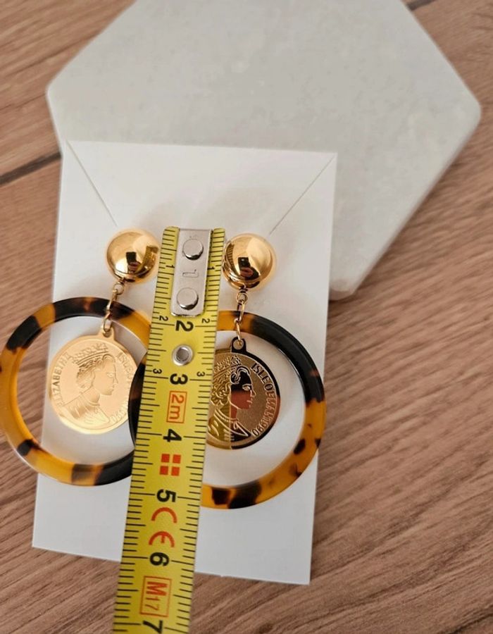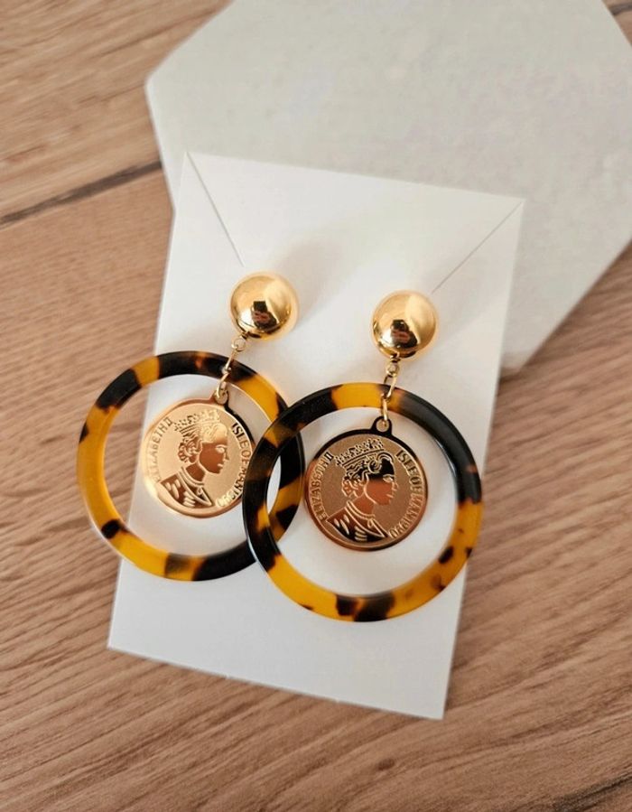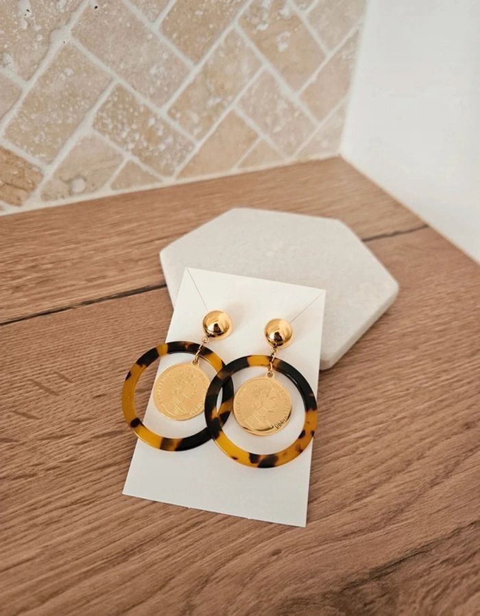 ⁃ boucles d'oreilles en acier inoxydable doré - pendent en acrylique - une breloque effet pièces - mesures sur les photos ⁃ jamais porté