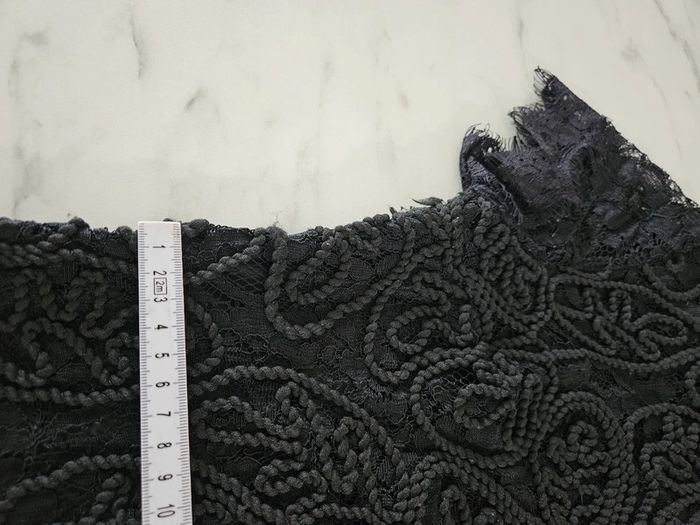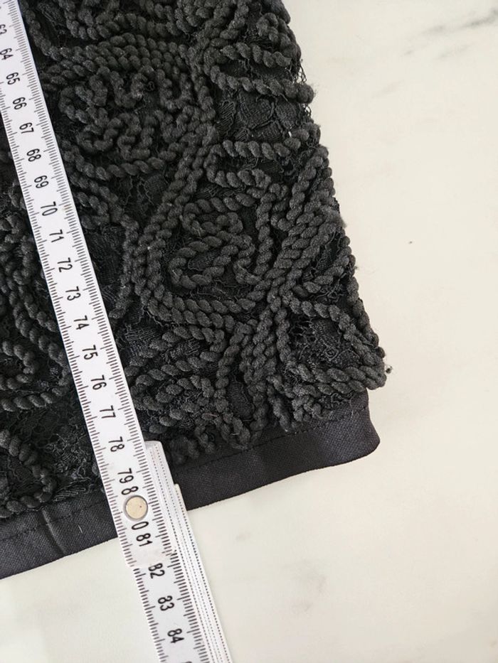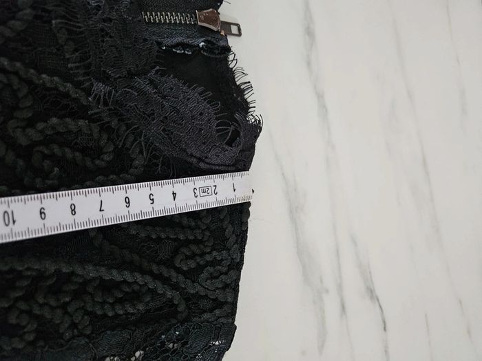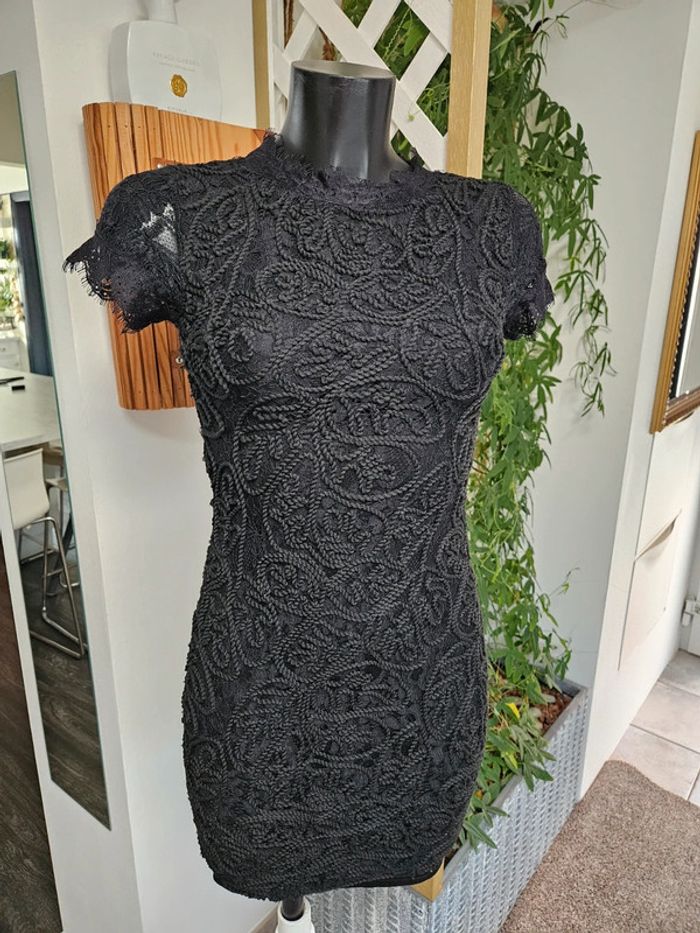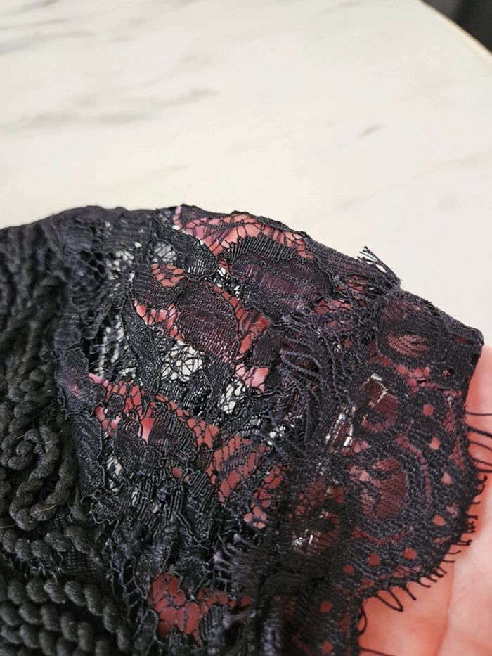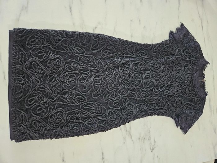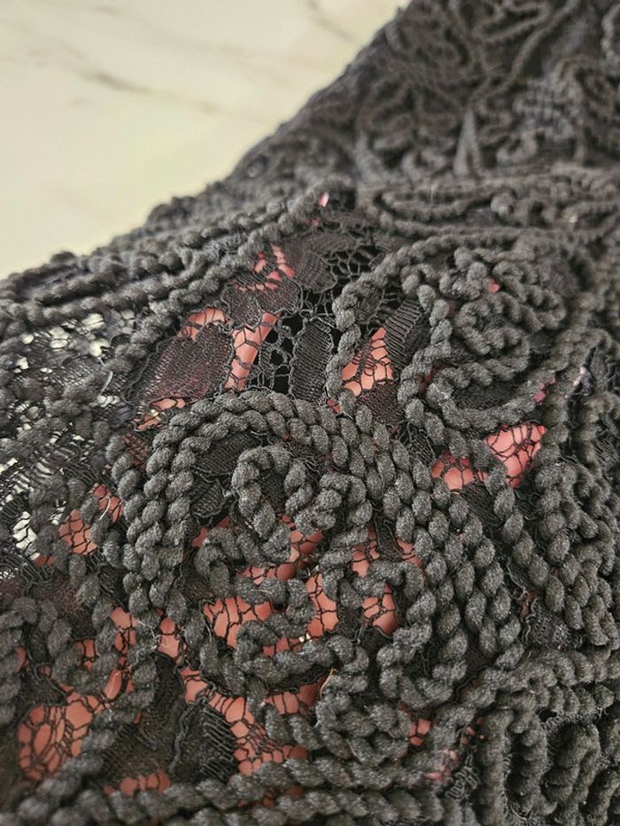 Robe noir en dentelle et corde. Portée mais elle reste en très bon état. Fermeture par tirette a l'arrière. Doublée satinée
