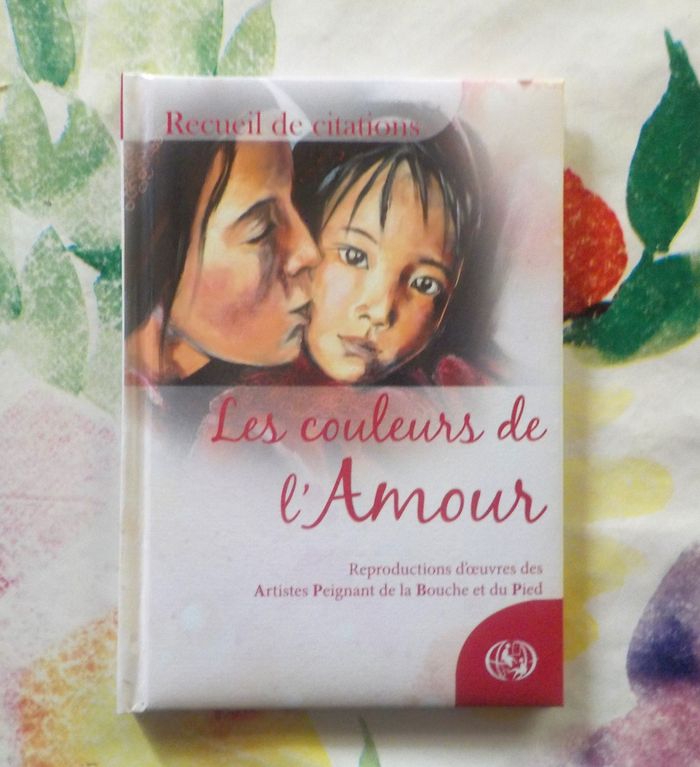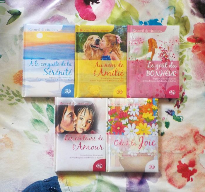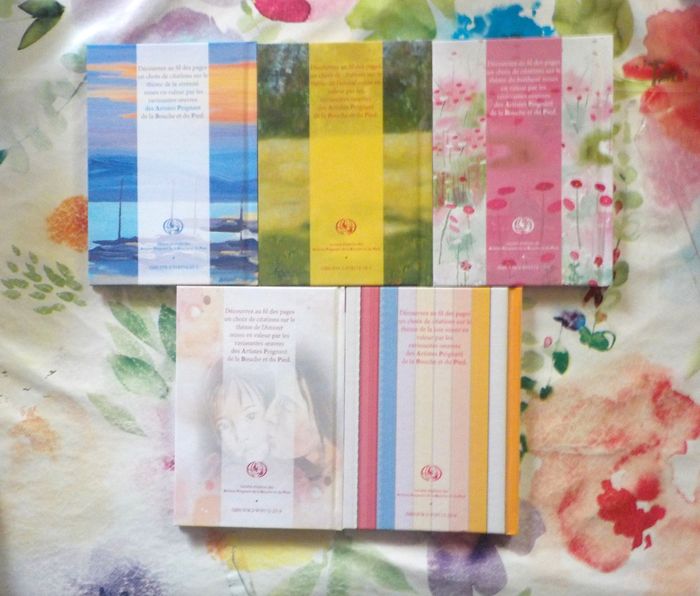 5 RECUEILS DE CITATIONS Reproductions d'oeuvres des Artistes Peignant de la Bouche et du Pied Ed. APBP Très bon état, comme neufs A la conquête de la Sérénité Au nom de l'Amitié Le goût du Bonheur Les couleurs de l'Amour Ode à la Joie