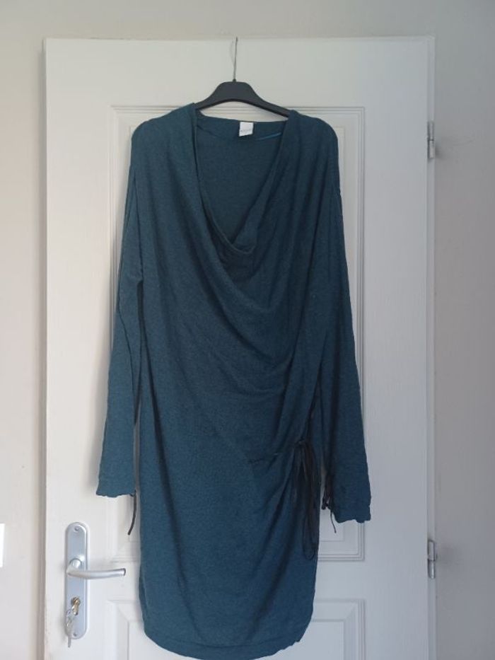 Portée quelques fois. Col drapé. Lien de resserrage à la taille et aux manches. Possibilité aussi de la porter en ajoutant une ceinture. Taille L marque Vila. N hésitez pas à regarder mon dressing que des petits prix et remises activées sur lots.