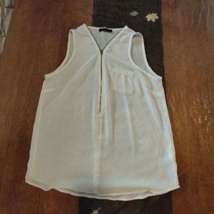 T-shirt sans manche blanc avec une petite poche qui vient de Kiabi du m et qui a était un peu porté