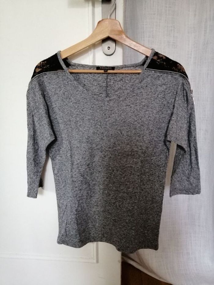 Tee shirt manche 3/4, gris moucheté avec dentelle sur les épaules Morgan Taille XS #fla8taillexs #fla8teeshirt