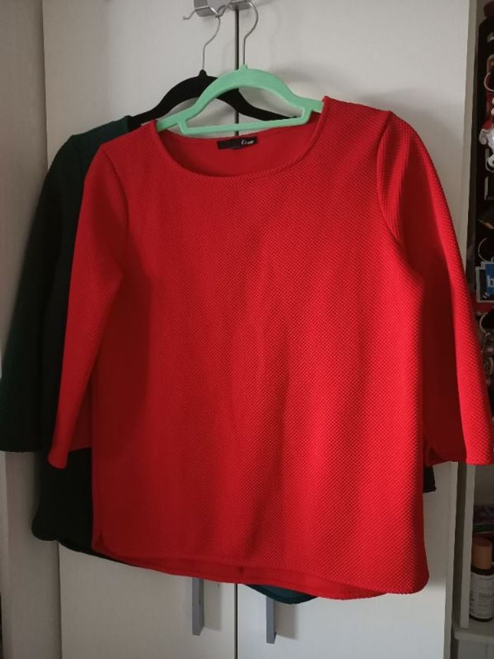 Lot de 2 hauts identiques taille S. Manches 3/4. Tissu nid d abeille. Un rouge et un vert
