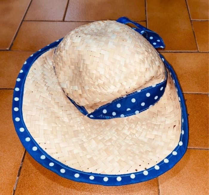 Chapeau paille avec liseret bleu à pois blanc neuf