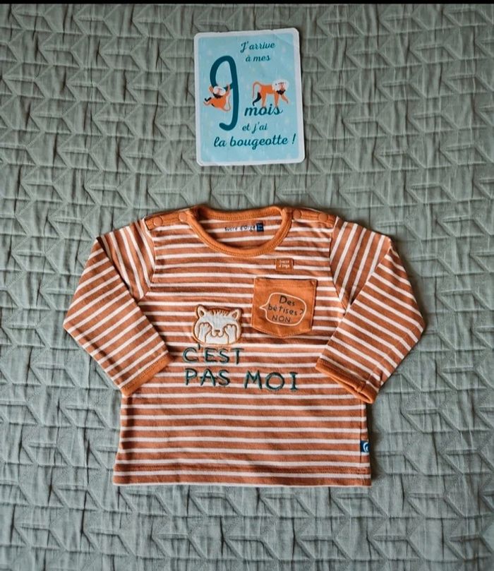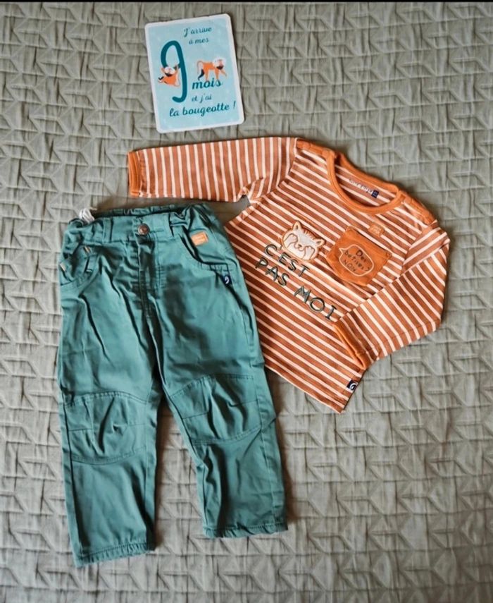 Ensemble de qualité Marque sucre d'orge Pantalon vert sapin T shirt manche longue marron rayé blanc Taille 9 mois 71 cm Peu porté en parfait état État neuf #lowchoupinettebebegarcon9mois